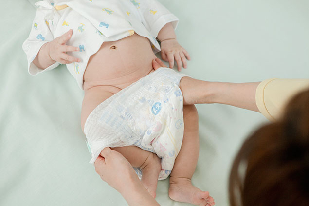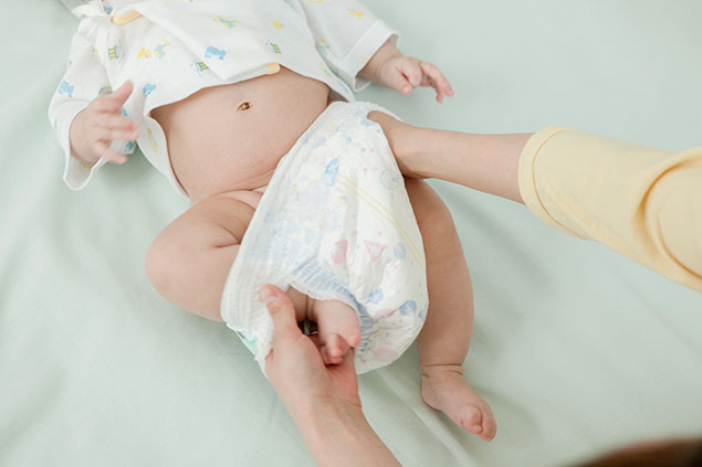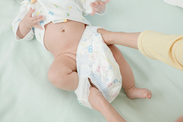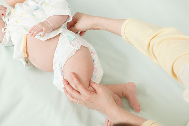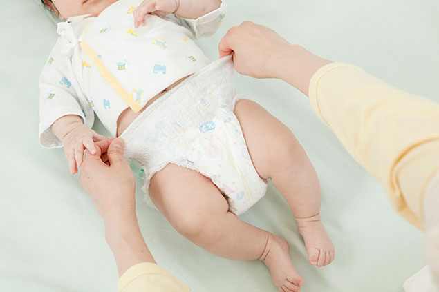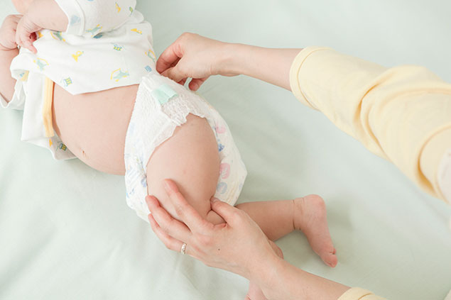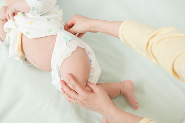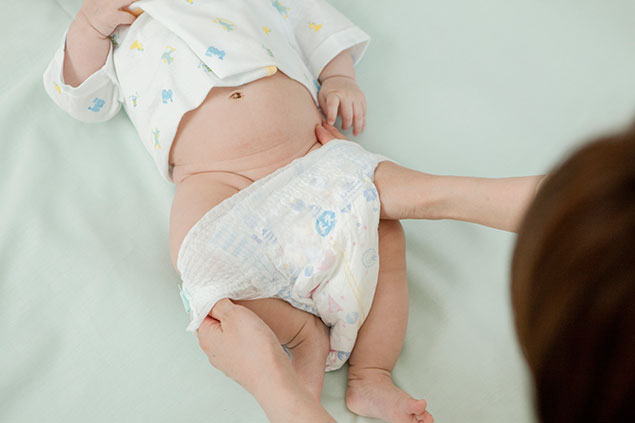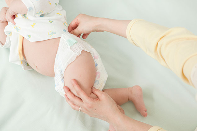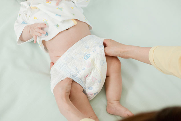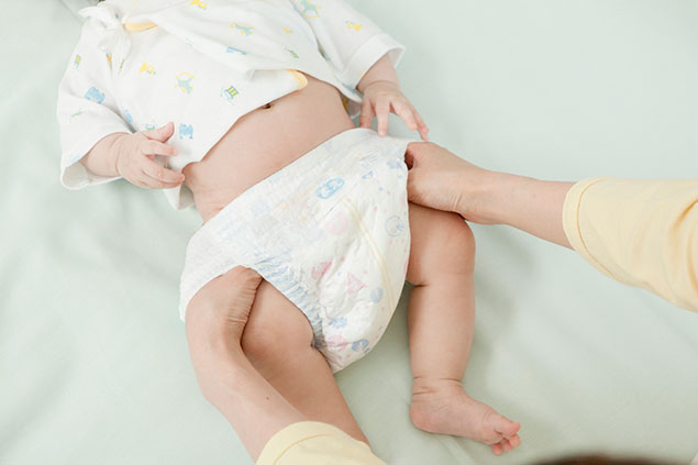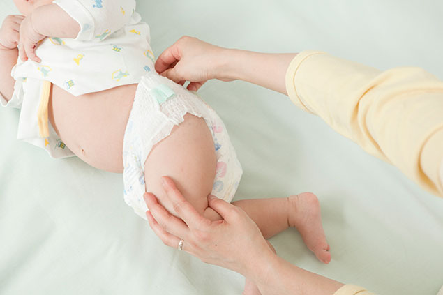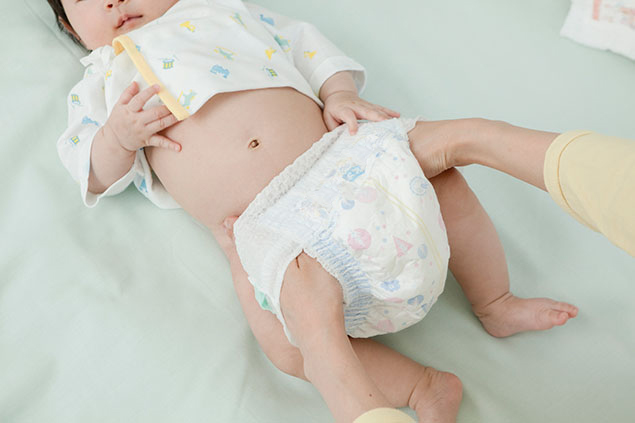 Cố định miếng tã bằng băng dính cuốn ở phía mông bé