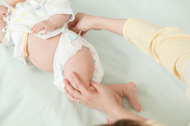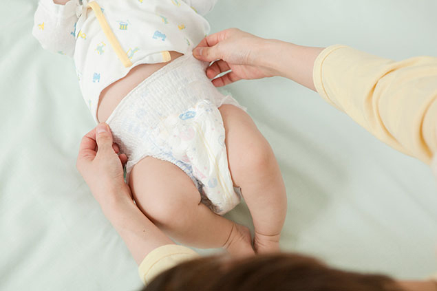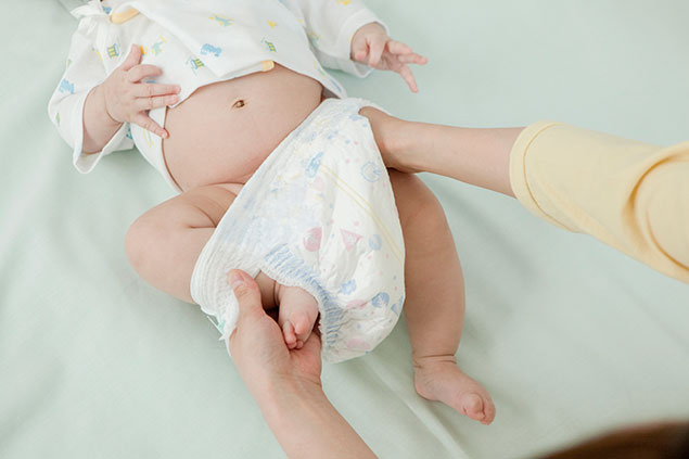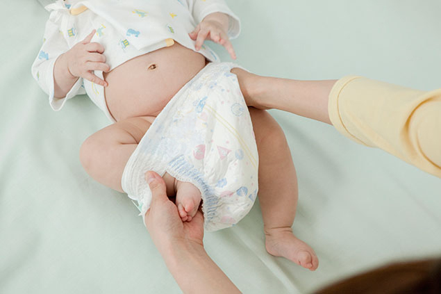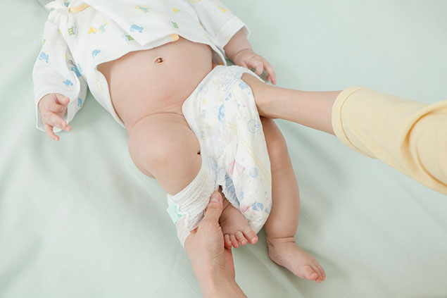 Giữ trẻ ở tư thế đứng, kéo tã lên lần lượt từng chân một.