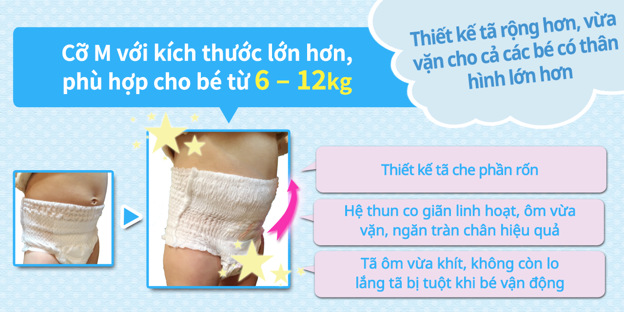 - Thun hông cao và mềm mại, giúp ôm vừa vặn, ngăn tràn tã hiệu quả, đồng thời giúp tã không bị tuột xuống khi bé di chuyển